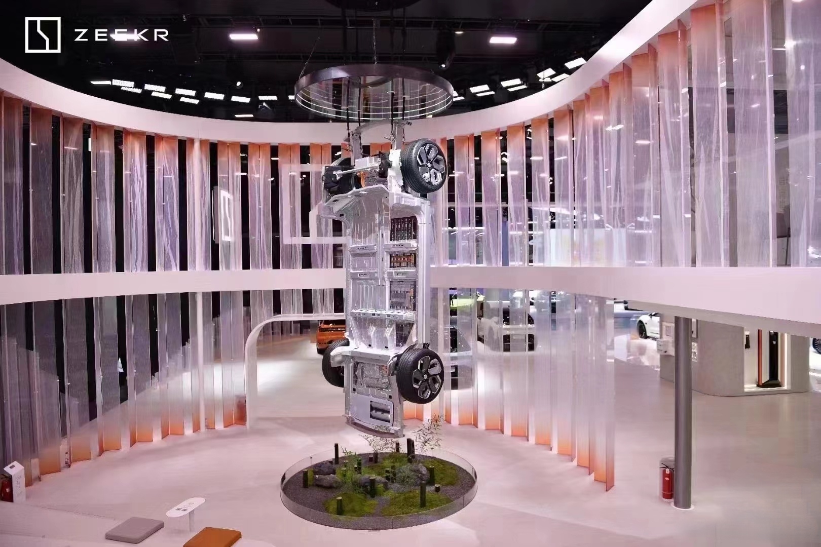 綠意茵茵的ZEEKR LIFE區:展臺上還設置了綠意茵茵的ZEEKR LIFE區,為觀眾帶來自然與科技的和諧共生之感。這種設計不僅增加了展臺的生態元素,還進一步提升了觀眾的觀展體驗。