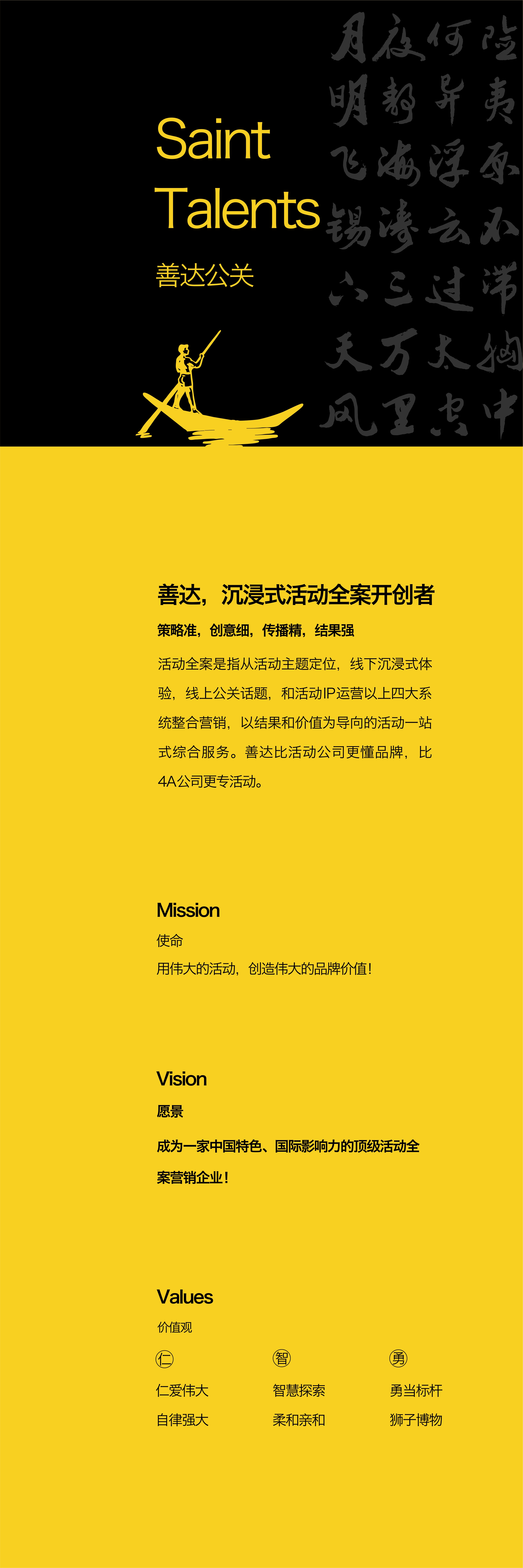 善達(dá)林森公關(guān)是沉浸式場(chǎng)景心流體驗(yàn)活動(dòng)達(dá)人基地,匯聚了全球時(shí)尚達(dá)人、創(chuàng)意達(dá)人、IP紅人,“達(dá)人精神”是善達(dá)之人才觀。不亂于心、智成一派、持經(jīng)通變、格物致知、止于至善,乃達(dá)人者也。善達(dá)之達(dá),達(dá)有不同,大有不同。善達(dá)達(dá)人之使命,以創(chuàng)意演繹商業(yè),以作品感動(dòng)世界。