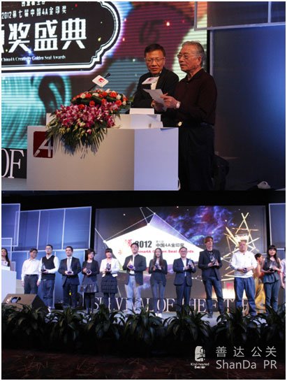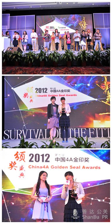 10月13日,以“創意者生存”為主題的2012年中國4A創意金印獎頒獎之夜在杭州落幕。在前期入圍的262件作品中,組委會評選出全場大獎2件,金獎9件,銀獎37件,銅獎80件,一如既往的保持著少而精的原則。其中靈思營銷《重慶,回來了》獲得網絡互動病毒式營銷類金獎,《重慶,回來—媽媽篇》和《看不見的真相》獲網絡互動病毒式營銷類銅獎,(文章來自活動策劃公司、上海公關公司),《餐中有鬼》《美杜莎篇》《線控兒童》三部作品獲得平面類入圍獎,此外,靈思營銷還獲得“中國4A突出貢獻獎”。