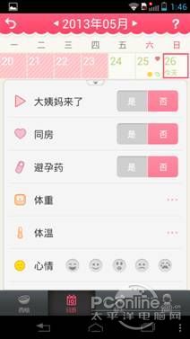 對(duì)女性用戶而言,使用這樣一款A(yù)PP可準(zhǔn)確記錄和推算月經(jīng)周期,并獲得較為全面、詳盡的小貼士,以解決各類生理難題。它提供了日歷功能,安全期、月經(jīng)期、危險(xiǎn)期一目了然,此外,用戶還可以錄入其他更詳細(xì)的信息,例如是否同房、是否吃避孕藥、體重、體溫、心情等等,便于全面記錄用戶的身體狀況,以建立詳細(xì)的個(gè)人檔案。