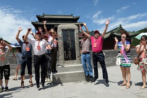 7月28日,前來參觀考察的勞動模范在北京居庸關長城上留影。當日,首批共200名全國勞動模范齊聚北京、北戴河集中休養,正式啟動2013年全國勞模休養活動。首批勞模休養活動從7月27日持續至8月2日,除在北京參觀考察外,勞模們還將前往北戴河度過一個難忘的假期。中華全國總工會于7月至11月期間,組織5000名勞模分33批前往北戴河、青島、廈門等11個休養基地“度假”。這是全國總工會開展勞模休養活動以來人數最多的一次。新華社記者 何俊昌 攝