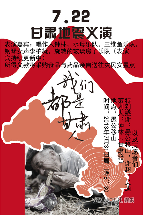 由甘肅天水籍音樂人鐘林發(fā)起組織的“我們都是甘肅人”主題賑災(zāi)義演,將于7月31日在北京“愚公移山LIVE HOUSE”舉行,當(dāng)晚,除了鐘林獻(xiàn)唱外,還將有五組藝人為本次義演登臺(tái)獻(xiàn)藝,他們分別是三維魚樂隊(duì),,水母樂隊(duì),“民謠女聲” 談麗君(甘肅天水籍),“鋼琴女聲”李柏凝,旋轉(zhuǎn)的玻璃房子樂隊(duì)。用鐘林的話來說,這將是一場充滿“文藝范兒”的義演,據(jù)悉,本次義演的全部收入,將用來采購急需物資,由專人負(fù)責(zé)送往災(zāi)區(qū)安置點(diǎn),為在此次地震中受災(zāi)的人們,盡一點(diǎn)綿薄之力。