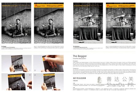 創意表現:運用真實的控線與紀實畫面結合,形成如同木偶控線般的效果,將“被操控的孩子”這個核心主題視覺化呈現,同時設計一個可以撕開的封條,(文章來自活動策劃公司、上海公關公司),當受眾撕開封條,束縛在孩子身上的真實控線,就會斷開落下,呈現解救他們的方法——“救護兒童會”。
