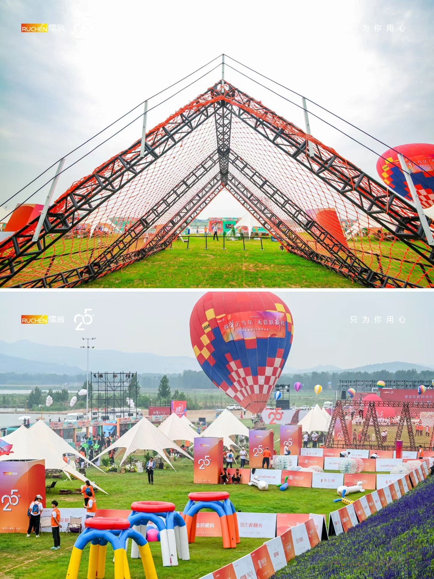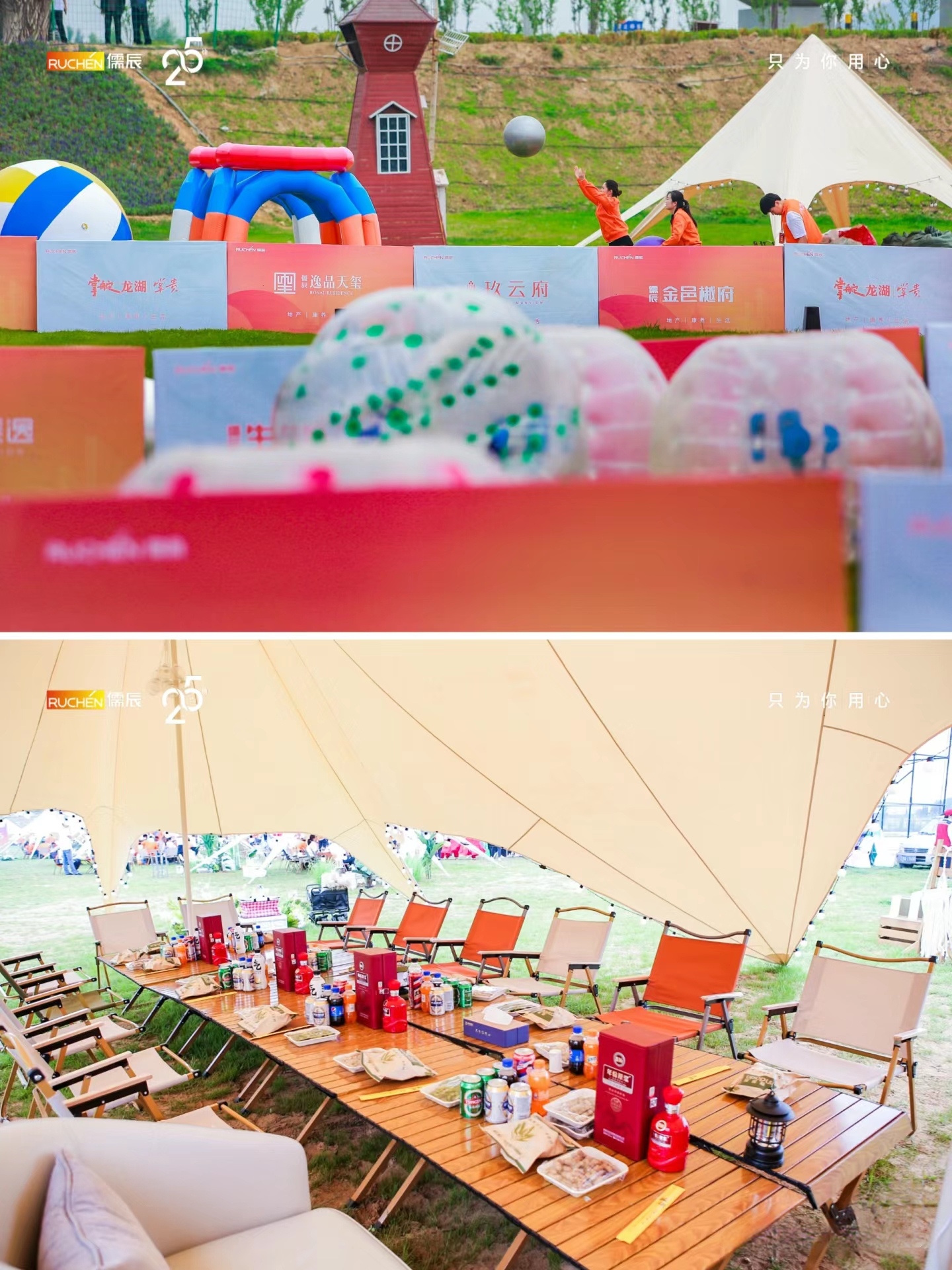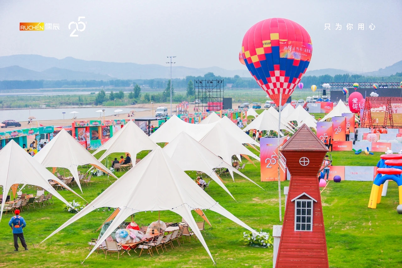 露營草地的精心布置:在松山的綠林與草坪上,露營草地成為了慶典活動(dòng)的重要一環(huán)。草地上鋪設(shè)了柔軟的草坪,設(shè)置了各種露營裝備,如帳篷、野餐墊、燒烤架等,營造出一個(gè)輕松愉快的戶外露營氛圍。同時(shí),草地上還擺放了儒辰集團(tuán)的標(biāo)志和周年慶典的橫幅,增強(qiáng)了活動(dòng)的主題感和歸屬感。