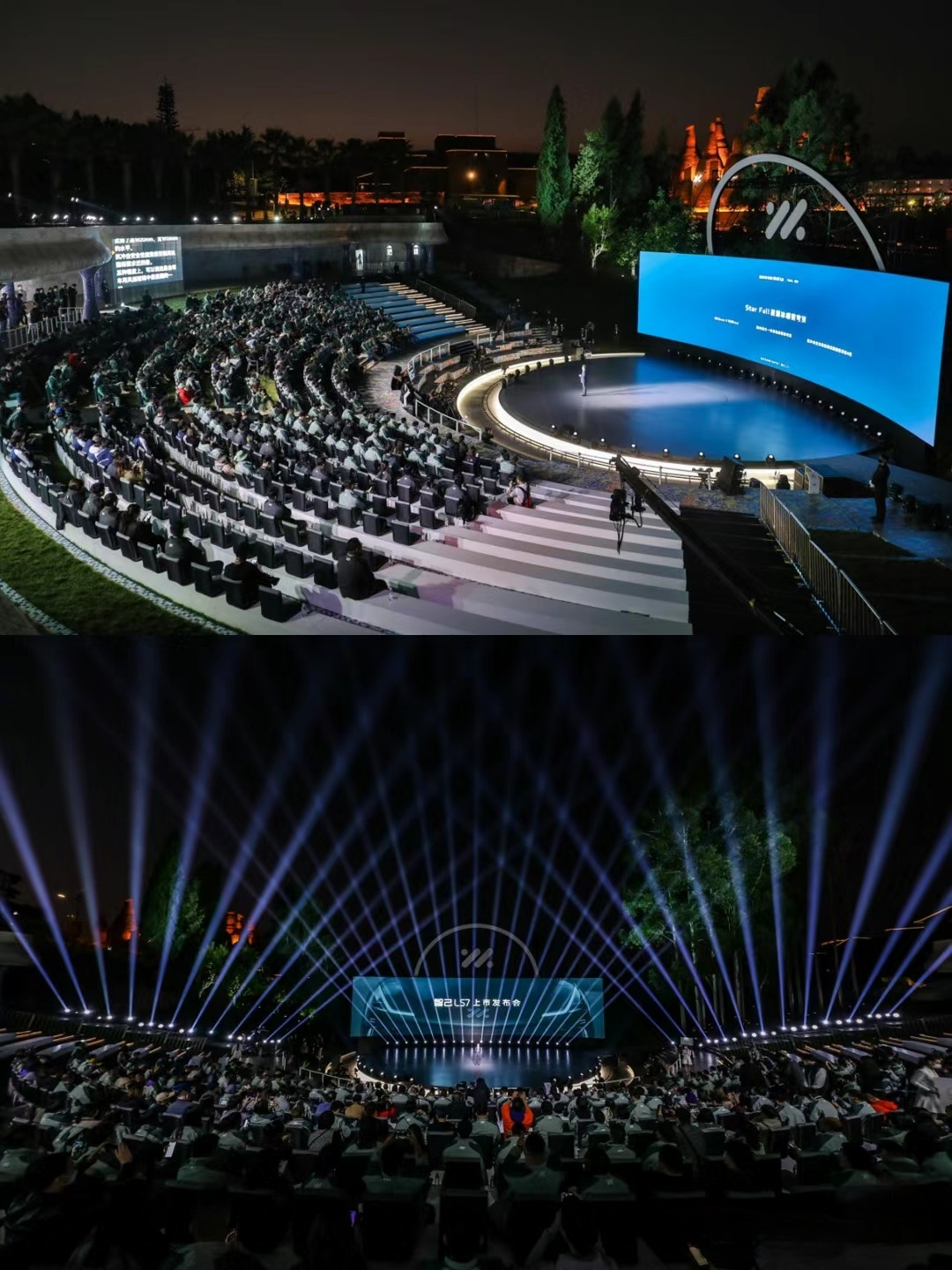 舞臺現場吊裝了直徑約14米的圓環發光裝置,與場地下沉式舞臺形狀相結合,光影變換間,發布會主角車型智己LS7驚艷亮相。