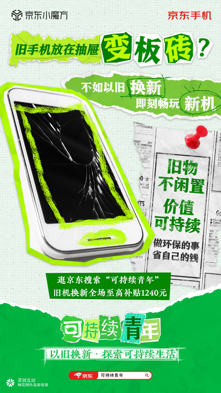 在2022年,靈銳互動向京東手機以舊換新活動提出了一個全新的主題IP—“可持續(xù)青年”。我們以“為舊物附贈新價值、延續(xù)舊物新生命”為主題方向,通過一系列的線上創(chuàng)新物料建立線上話題,帶動對于“可持續(xù)生活”理念有高關注度的青年群體積極參與到活動中。