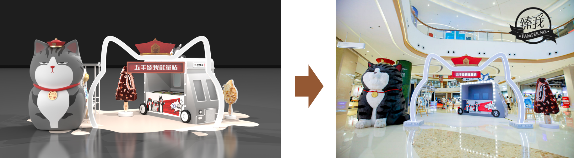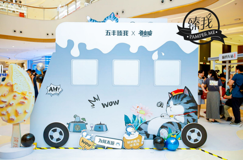 現場入口處3米巨型“吾皇”+臻我冰淇淋裝置,在品牌環繞的商城中強勢吸睛,吸引顧客拍照打卡合理的空間布局有效幫助規避場地干擾,使品牌更加醒目